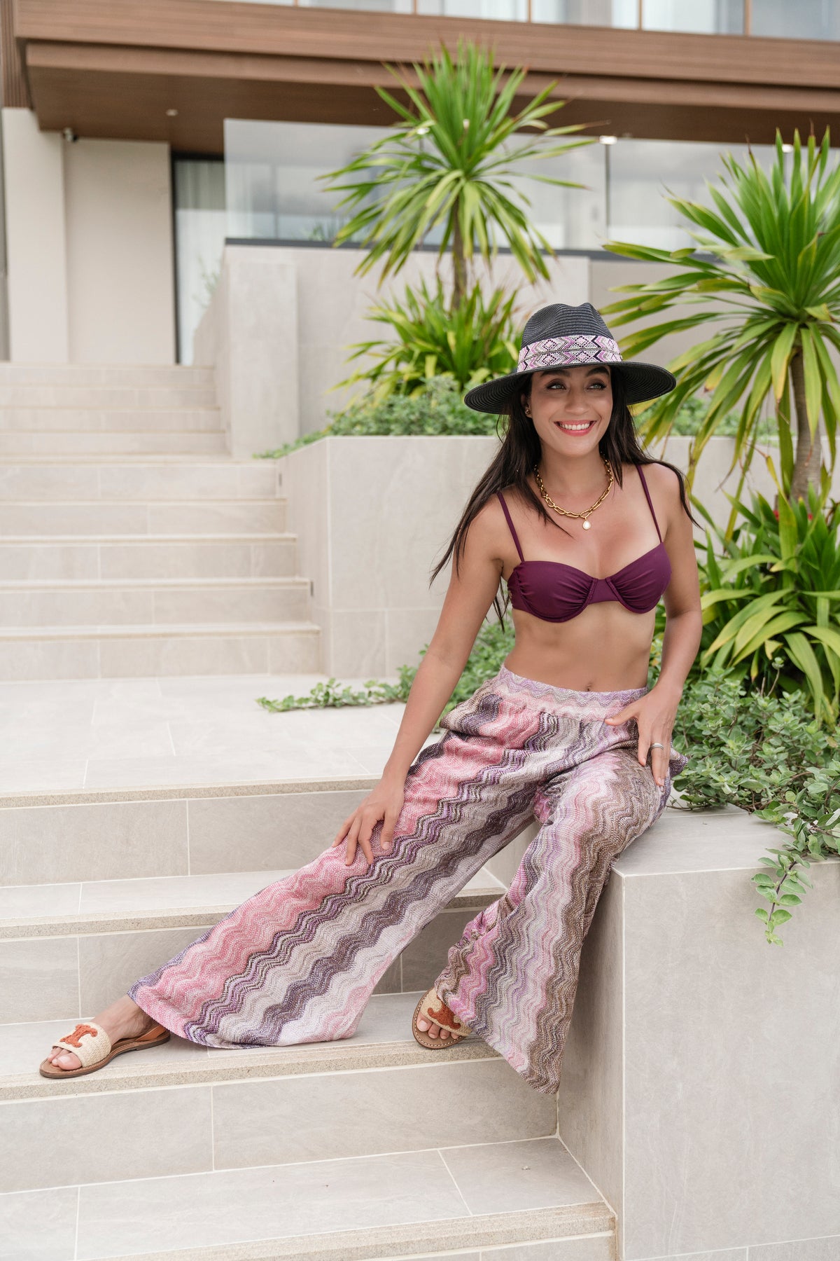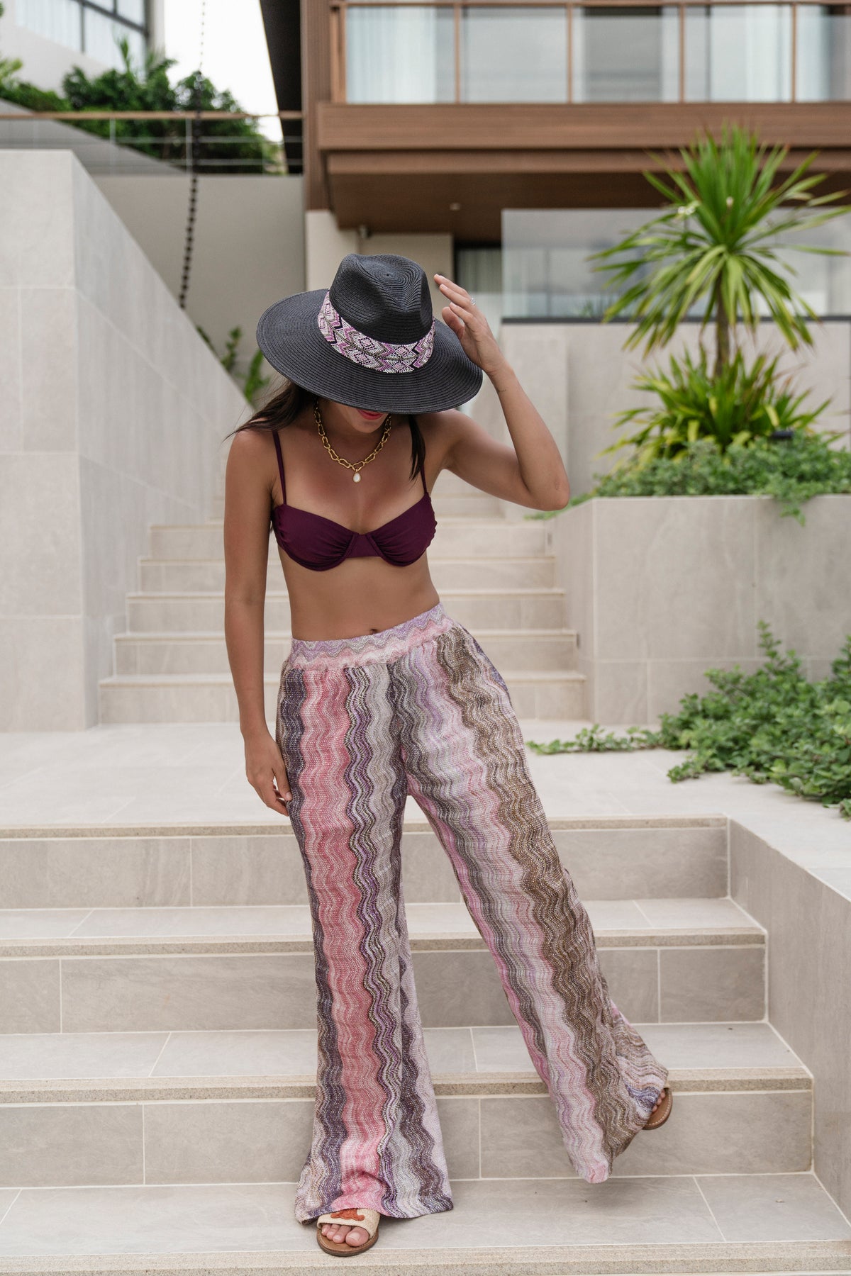 Hetaste byxorna för semestern, i denna rosa/grå/guldiga kombination. Fickor på sidorna och en liten sandfärgad innerboxer. Flame finns so ponch och en lång öppen kaftan klänning också.