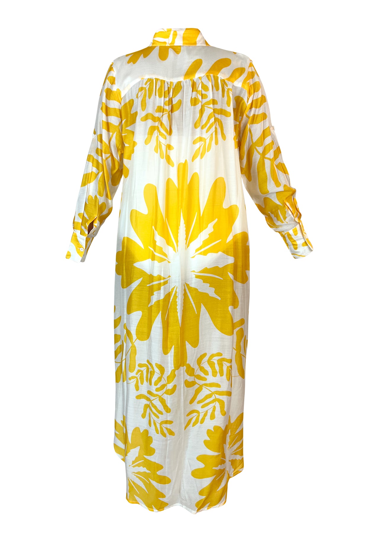 Skjortklänning med över dimensionerat mönster av en gul blomma på vit botten, lite ”Mary Quant” inspirerat. Samma underbara tyg som vanligt i mjukaste viskos modal.