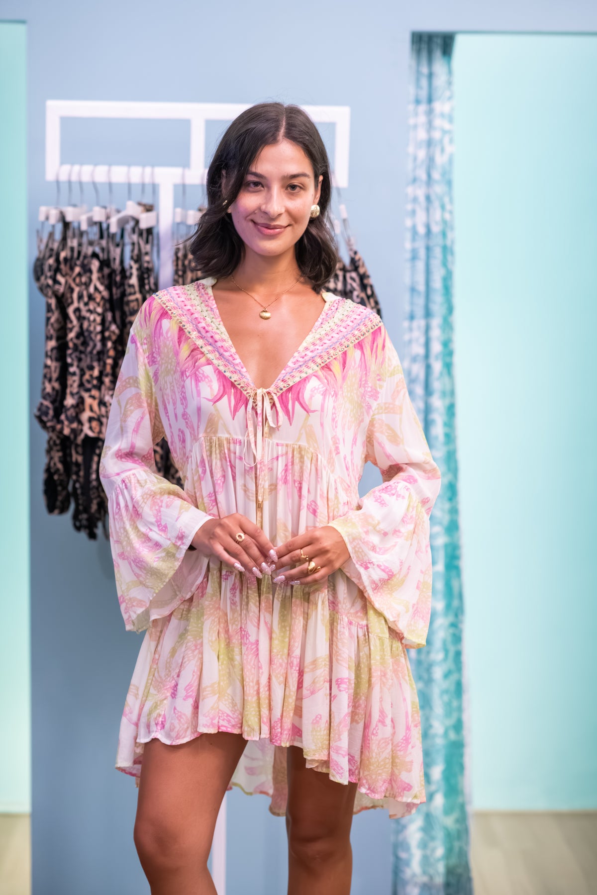 A-line kort klänning med våder av volanger och klockformad ärm. Knyt där fram i en ganska djup urringning. En liten krage runt om.