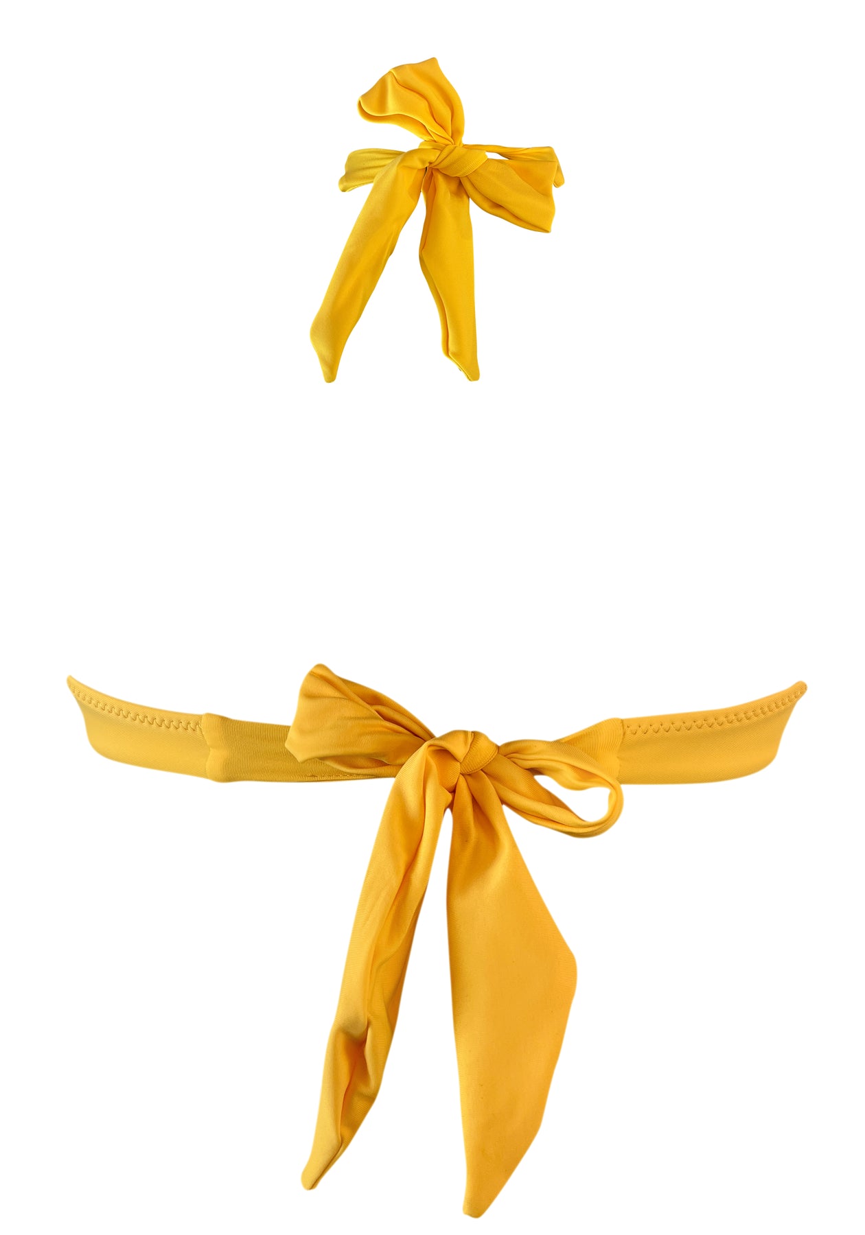 Venus Halter bikini i en varm gul färg. Modeller är bra, speciellt om du vill ha mer stöd för bysten. Venus har det kända vågformade kanten (från kammusslan)- runt halsen och urringningen. Toppen har bygel & uttagbar stoppning, knyts i nacken och där bak. Matcha gärna med Venus Limonade medelhög byxa. Kaanda signatur love knot heat transfer i guld.
