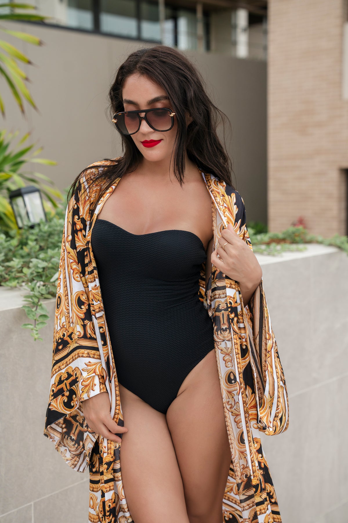 Vackra Giovanna baroque print i en lyxig lång ny kimono. Passar till din svarta bikini eller baddräkt, ärmarna är vida som en klassisk japansk kimono.